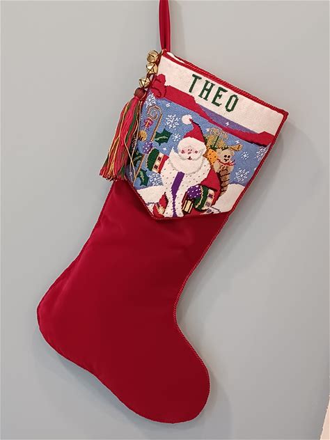 Personalized Christmas Stocking In Fabric And Hand-Embroidered Cross-Stitch Cuff Dimensions 00287