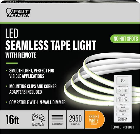 Feit Electric 16ft LED Tape Light, Dimmable, Plug-In/Direct Wire LED Ultrathin Strip Lights For Home, 2950 Lumens, 3000K Bright White, Remote Control Included, 25,000-Hour Lifetime, TAPE192/COB/LED