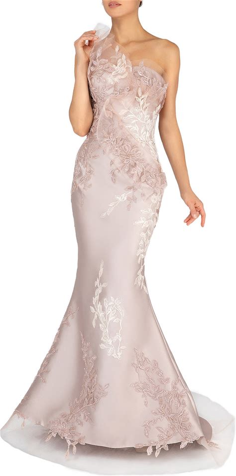 Terani Couture One Shoulder Beaded Tulle Mermaid Gown, Womens, 14, Champagne