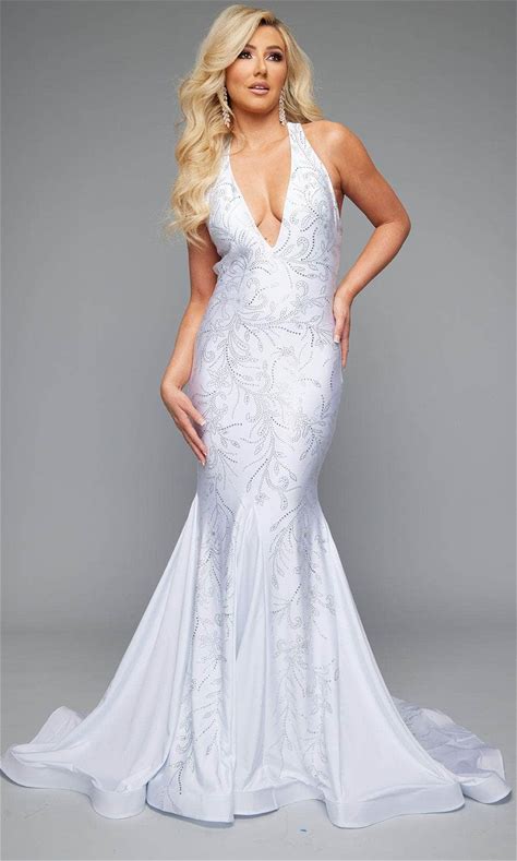 Jasz Couture 7609 - Long Stretch Jersey Mermaid Dress - Halter, Fitted Bodice, Rhinestone Embellishments, Open Back, Mermaid Skirt 14 / White - Shop