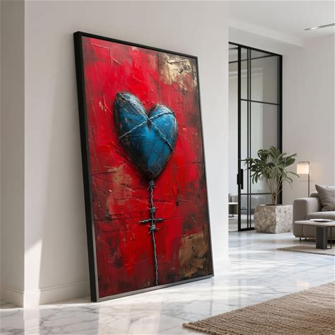 Blue Heart Balloon With Barbed Wire, Abstract Red Canvas Wall Art, Contemporary Love Symbol Painting, Emotional Expression Home Decor