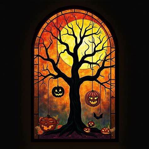 Halloween Stained Glass Window Privacy Film - Custom Size Gothic Tree With Pumpkin Lanterns - Static Cling Decorative Window Vinyl For Home