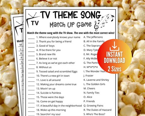 TV Sitcom Theme Song Match, Television Trivia Game Quiz, Printable Game For Kids & Adults, Family Game Night, Office Party Fun,TV Show Party