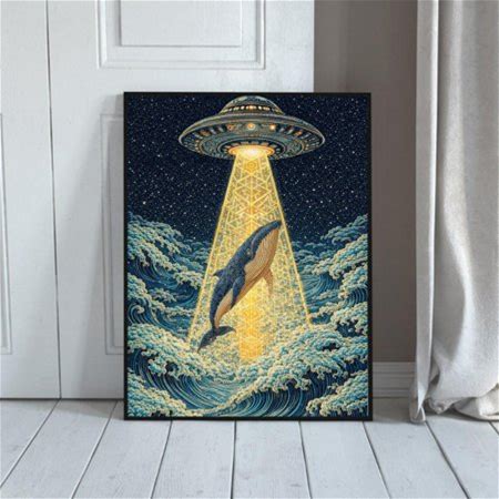 Ufo Whale Abduction Poster, Surreal UFO Wall Art, Alien Sci-Fi Decor, Unframed Canvas 16x20in