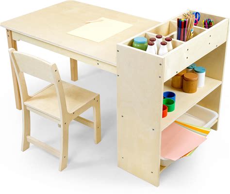 Guidecraft Arts And Crafts Center: Kids Activity Table And Drawing Desk With Stools, Storage Canvas Bins, Paper Roller, And Paint Cups | Toddlers Work Station - Children's Wooden Learning Furniture