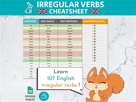 107 English Irregular Verbs Cheatsheet | Editable Google Sheets Template | English Grammar Chart | ESL Learning Tool | Language Learning