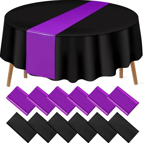 12Pack 12X108 Inch Satin Table Runner And 84 Inch Round Plastic Tablecloths Set Black Purple Disposable Round Table Cover For Graduation Wedding