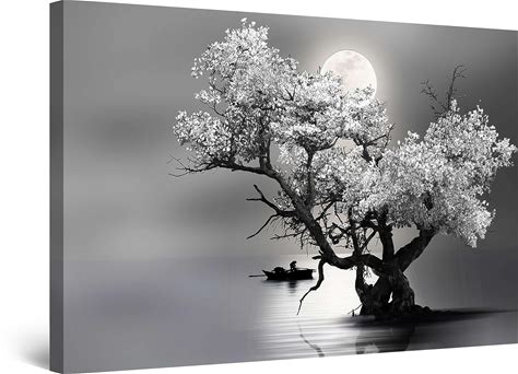 Startonight Canvas Wall Art Decor Flower Tree And Moon Black And White Painting For Living Room, Original And Unique Luminous Wall Art Minimalism