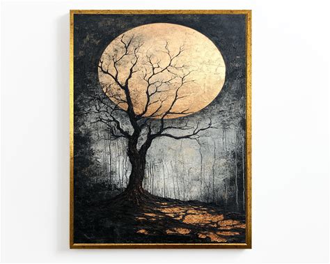 Haunted Forest Full Moon Art Print Gothic Tree Silhouette Wall Art, Spooky Landscape Illustration, Oil Painting Style Decor For Moody Rooms