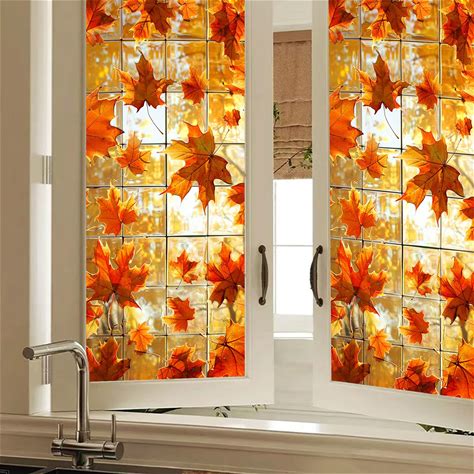 HOMETITUTE Window Film Decorative 18X39 Inch PVC Autumn Maple Leaf Grid Design Stained Glass Window Cling Privacy Film For Glass Panel Indoor Outdoor