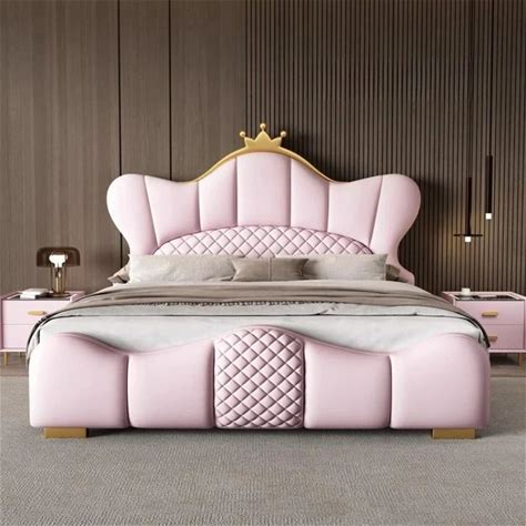 Toauuo Lovely Crown Fantasy Princess Bed - Tufted Headboard, PU Leather Upholstery, Pink+Cream Color