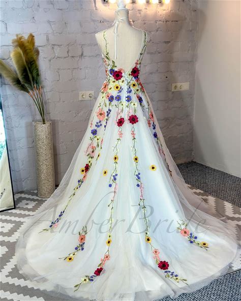 Floral Romantic Wedding Dress Colorful Floral Wedding Dress Rustic Wildflower Wedding Dress Backless Boho Wedding Dress With Flowers