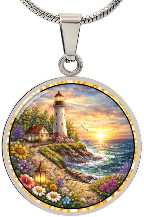Floral Lighthouse Floral Engraved Jewelry | Beach Lover Necklace, Bracelet, Keyring | Green Ocean Pendant